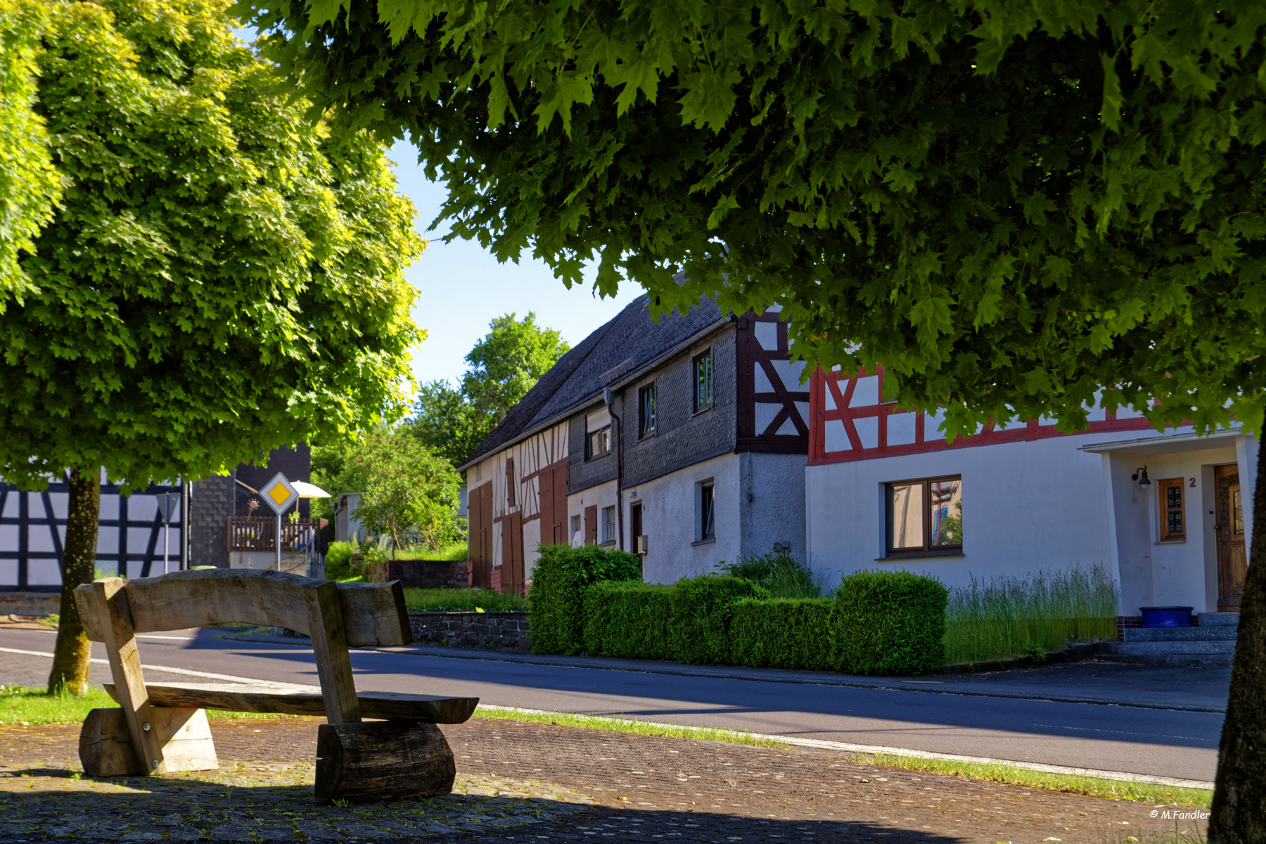 Der Ortskern im "Unterdorf" wird geprägt von den Fassaden alter, aber neu renovierter Fachwerkhäuser und der ehemaligen Dorfschule mit Glockenturm.
